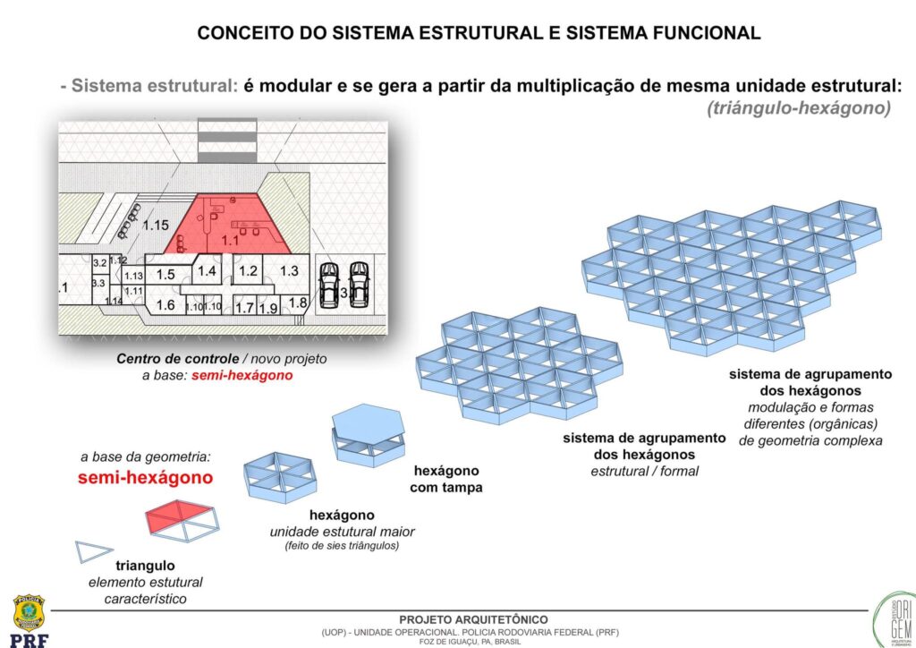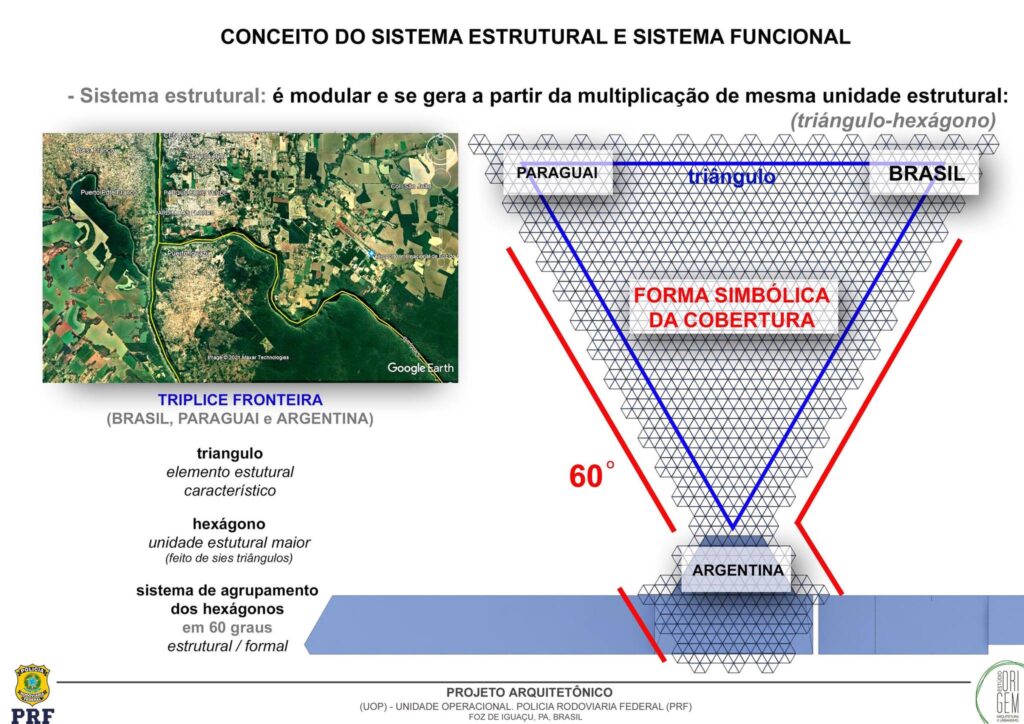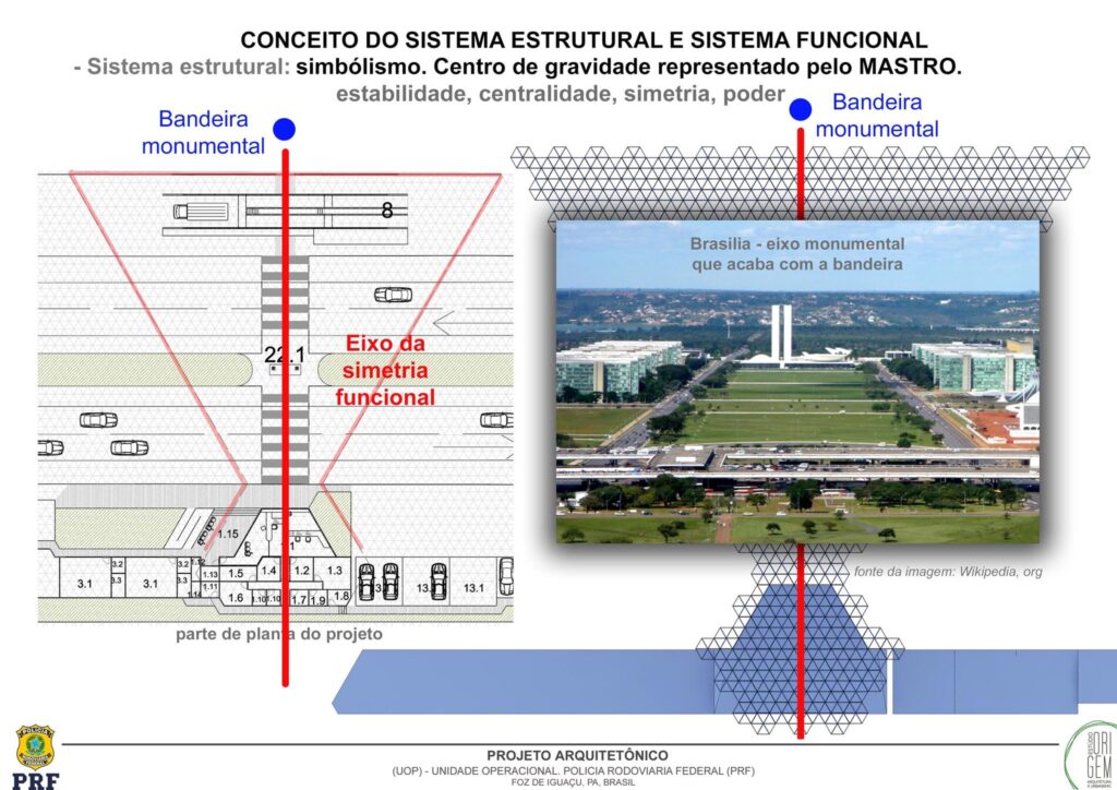 O eixo central da unidade está localizado no ponto de gravidade desse triângulo, sobre a megaestrutura da cobertura central de 1.780 m², criando uma simetria proposital que simboliza estabilidade, centralidade e poder, valores que refletem o papel da PRF na república.